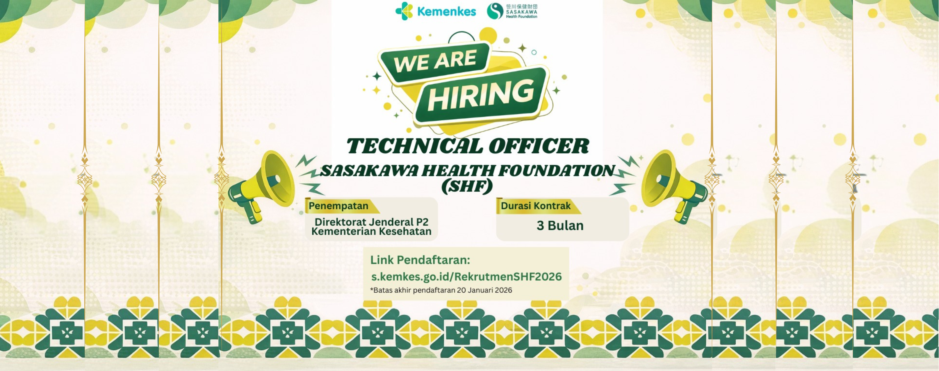 Inilah kesempatan Anda bergabung bersama Direktorat Penyakit Menular, Direktorat Jenderal Penanggulangan Penyakit, Portal Berita Kesehatan WRI Indonesia sebagai Technical Officer Sasakawa Health Foundation (SHF) Tahun 2026.